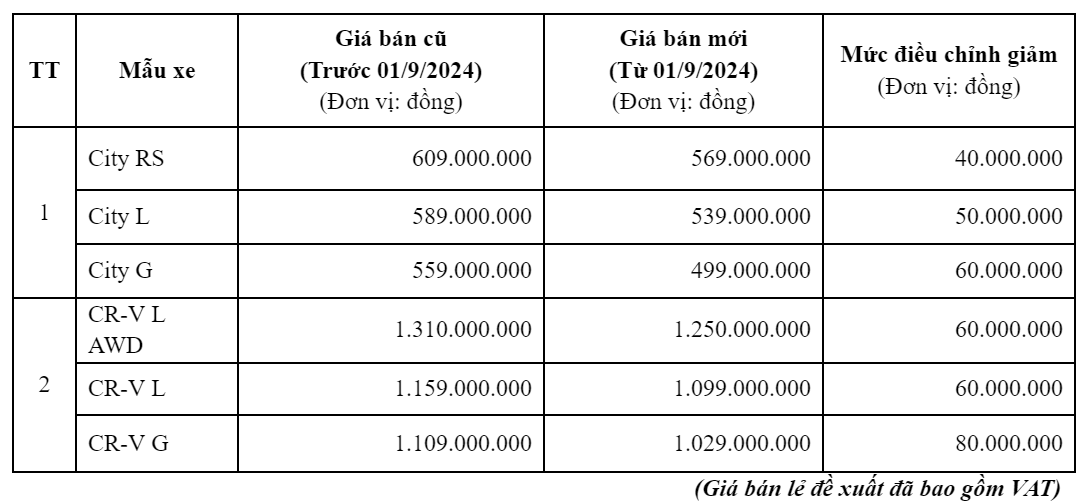 Giá bán lẻ đề xuất mới áp dụng từ 01/09/2024 cho Honda City và Honda CR-V các phiên bản động cơ xăng